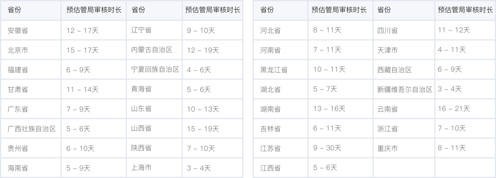各個省管局預計審核時長,實際審核時長會根據備案場景有所不同,下表格僅供參考。詳情可查看 詳細規則。